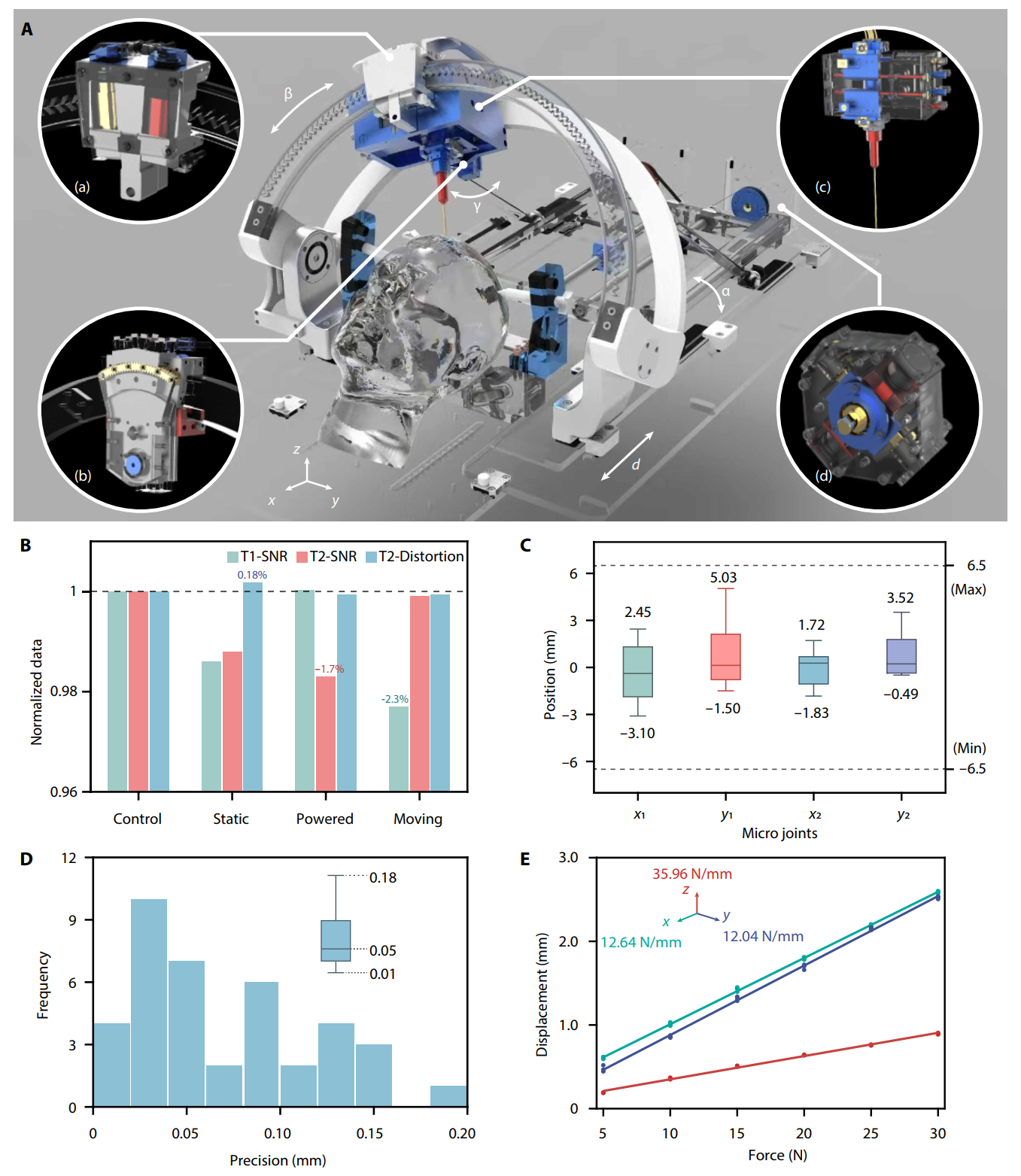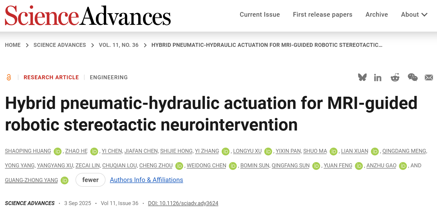 前不久,该项目最新研究成果的相关论文已以“Hybrid pneumatic-hydraulic actuation for MRI-guided robotic stereotactic neurointervention”为题,发表于《Science Advances》。论文共同第一作者为上海交通大学医学院附属同仁医院黄少平博士后与上海交通大学何钊博士后,通讯作者为上海交通大学杨广中教授、高安柱教授、冯原教授以及上海交通大学医学院附属瑞金医院孙青芳主任医师。研究得到了国家重点研发计划、国家自然科学基金及上海市科技专项等项目的资助,并受到工业和信息化部产业发展促进中心、磁共振诊疗高端技术国家工程研究中心、上海市科学技术委员会、上海市医疗机器人技术创新中心、上海市柔性医疗机器人重点实验室、上海交通大学医疗机器人研究院、上海交通大学生物医学工程学院、上海交通大学自动化与感知学院、上海交通大学医学院附属瑞金医院等单位的支持。