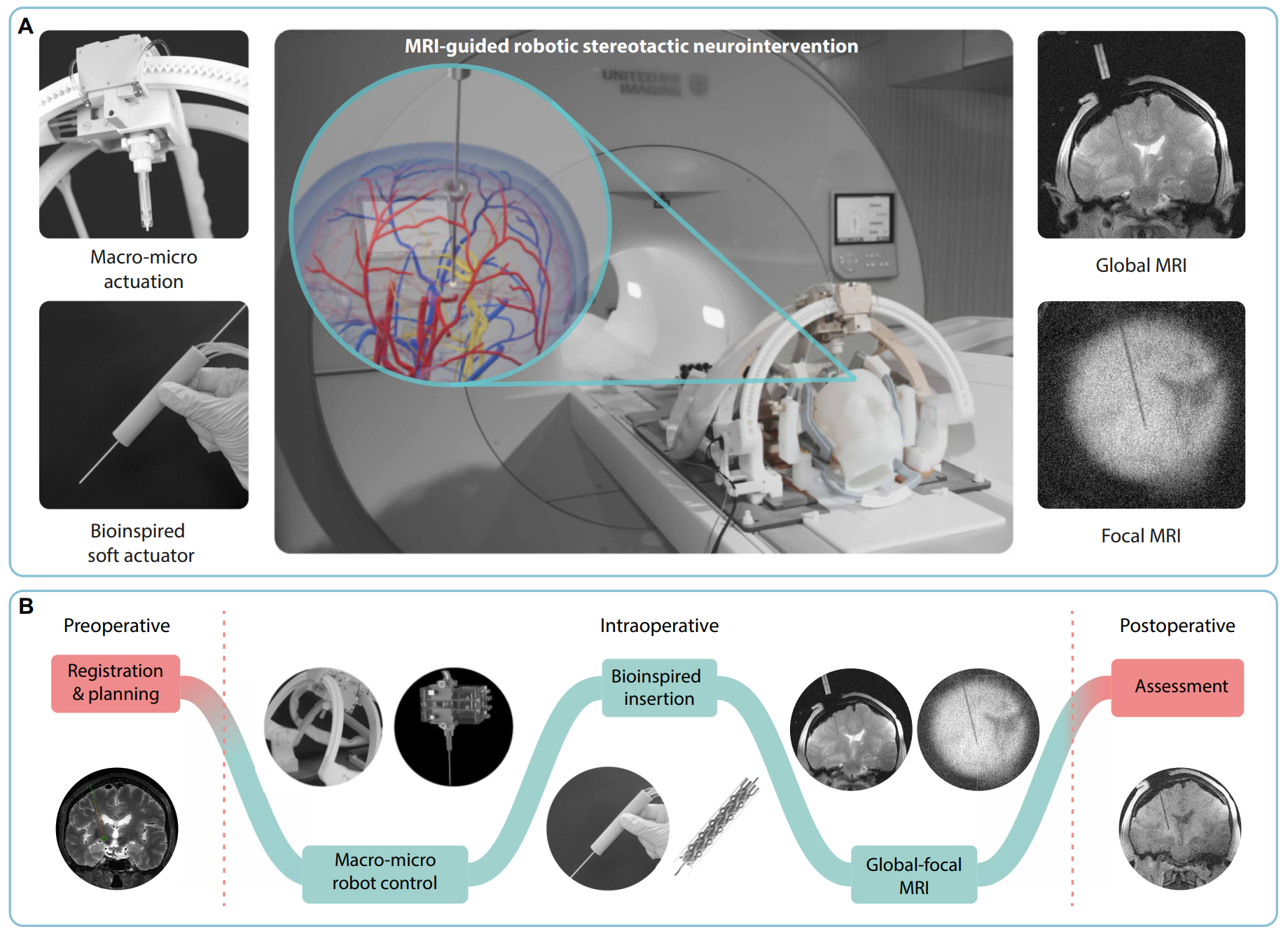 近日,由上海交通大学医疗机器人研究院、上海市柔性医疗机器人重点实验室杨广中教授团队牵头承担的这一专项取得重要进展。该团队首创机器人气液宏微驱动、仿生蠕动穿刺针驱动及术中宏微磁共振成像技术,并提出了一种术中磁共振影像导航的脑神经介入手术机器人系统,即MRI引导机器人立体定向神经介入系统。
