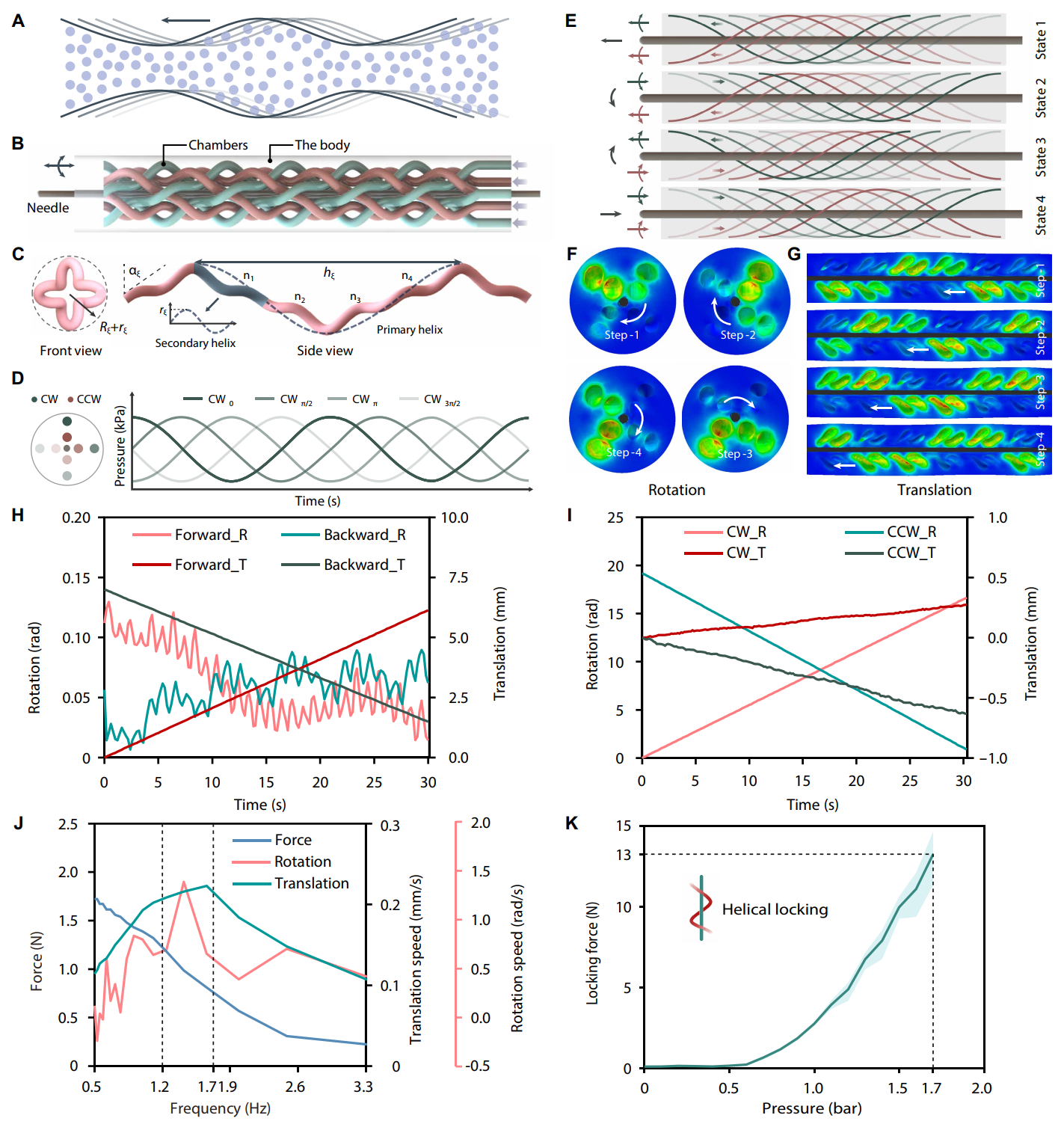 针对长距离穿刺操作中的精准性和稳定性需求,团队开发了一款2自由度仿生蠕动式软体驱动器。该装置受生物体蠕动机制启发,突破了传统刚性传动限制,能够在有限空间内实现穿刺针的旋转与输送运动。基于行波推送原理,驱动器可独立控制针体的旋转和平移动作。在1.2-1.7 Hz工作频率下,其平移速度超过0.2 mm/s,旋转速度大于0.5 rad/s,穿刺力高于0.8 N,最大锁定力可达13 N,表现出良好的锁紧性能和运动稳定性,有效解决了受限空间内长行程精准穿刺的操作难题。