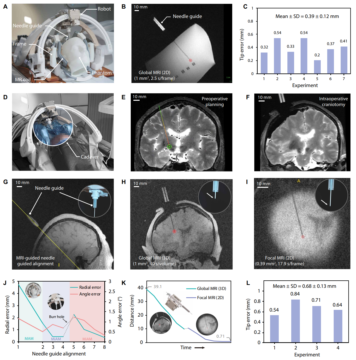在仿人环境的体模实验中,项目团队采用明胶填充的3D打印人类头骨模型,其中嵌入孔状无磁标记作为目标点。通过术前MRI图像规划路径,由机器人系统对齐显影鞘管与规划路径。穿刺时先预插入约10 mm,再在全局MRI引导下由软体驱动器完成最终推进。七次不同靶点定位结果显示,针尖与目标点误差均小于1 mm,平均精度达0.39±0.12 mm,初步证明系统具备亚毫米级定位能力。