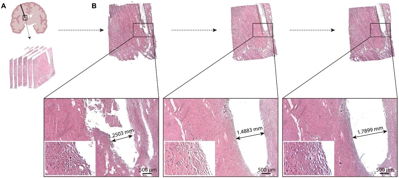 为检验系统在接近真实手术条件下的表现,项目团队在四例人体标本中进行了实验。在术前MRI中规划底丘脑核(STN)为靶点,平均深度约65 mm。开颅后术中MRI发现明显脑结构或位置偏移,医生据此更新路径,导航系统重新发送数据并进行局部微调。术后MRI显示最终定位精度为0.68±0.13 mm,表明系统在应对术中解剖变化时仍保持高准确度。组织学分析显示针道最大宽度为1.79 mm,未见明显结构性破坏。