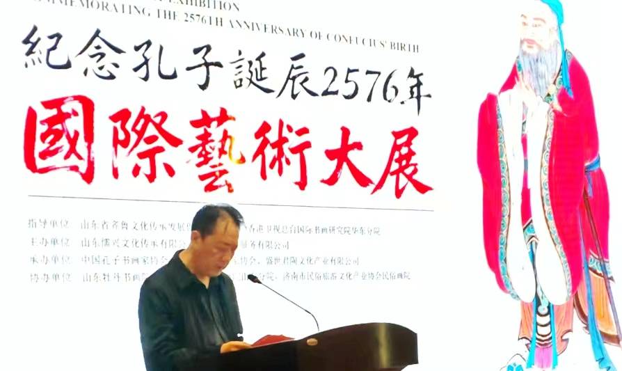 山东省齐鲁文化传承发展促进会艺术委员会书记兼书画院院长王占湖在致辞中表示,9月28日,是伟大的哲学家,思想家,教育家孔子诞辰2576周年纪念日。儒学是中华民族的巨大精神财富。是人类伟大的思想宝库,以孔子为代表的儒家文化绝非仅仅是哲学和知识的学问。而是存心立世的基本态度。是实实在在的生活的学问,是我们宝贵的思想源泉,人生指南,修身养性的不二准则。今天,中国孔子书画研究院在这里举办庆祝孔子诞辰2576年书画展,正是对齐鲁文化的传承发展,更是对孔子倡导的“仁,义,礼,智,信”的发杨光大。本次书画展,充分体现了作品的多样性,主题鲜明,苍劲有力。每一幅作品都饱含着艺术家的深情厚谊,是他们用笔墨向伟大的思想家,教育家致敬。
