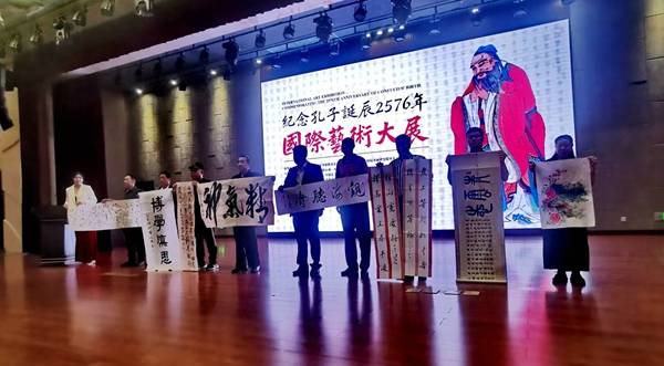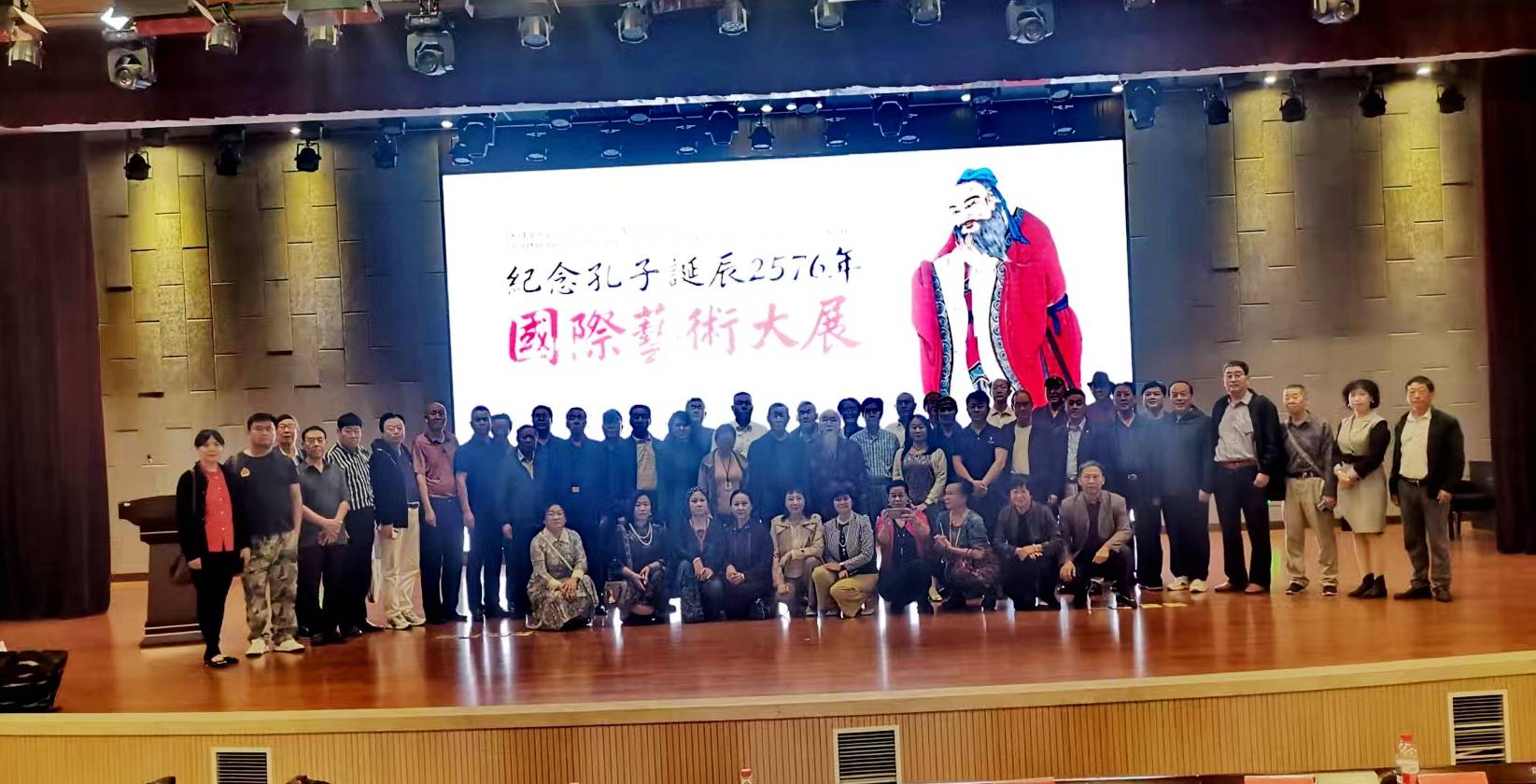 为深入学习贯彻习关于弘扬中华民族优秀传统文化的重要讲话及党的二十大精神,纪念伟大的思想家、政治家、教育家、儒家学派创始人--孔子诞辰2576年暨中国孔子书画研究院建院17周年,9月26日,由孔子七十三代嫡孙孔庆旭代表中国孔子书画研究院发起,山东省齐鲁文化传承发展促进会书画院、香港卫视总台国际书画研究院指导,山东儒兴文化传承有限公司、人民保健服务有限公司主办,山东牡丹书画院、北京艺博林轩书画院山东分院、济南红色旌旗飘飘泽君书画院、中国孔子书画家协会、中国孔子收藏家协会、盛世君陶文化产业有限公司、济南市民俗旅游文化产业协会民俗画院协办的“2025纪念孔子诞辰2576年暨中国孔子书画研究院建院17周年中国(国际)名家书画展”在山东省泰安市岱岳区隆重举办。