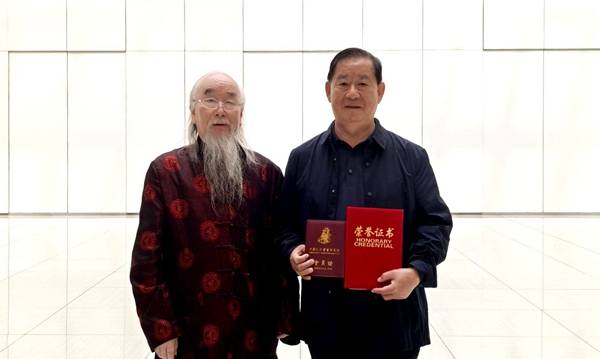中国孔子书画研究院院长孔庆旭向入会艺术家颁发证书:中国孔子书画研究院院士范开利,副院长孙乐翎,常务理事高堂、贺林、王中胜,理事朱忠国。