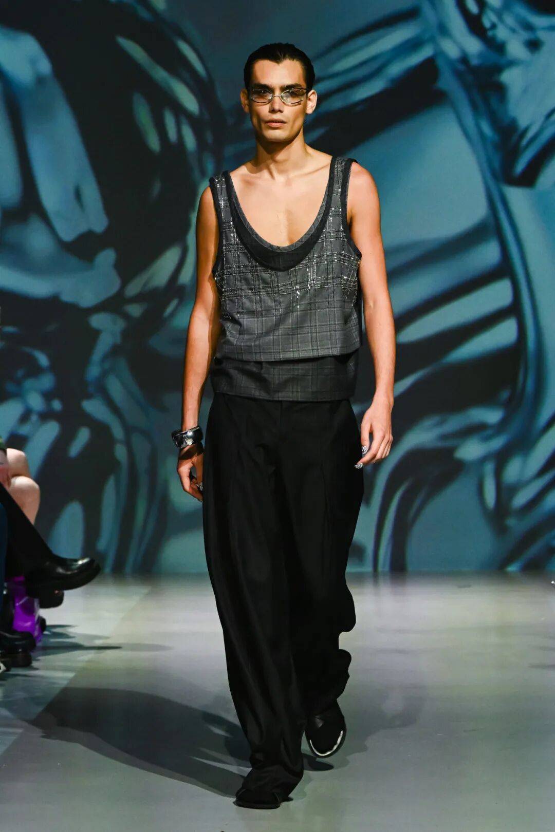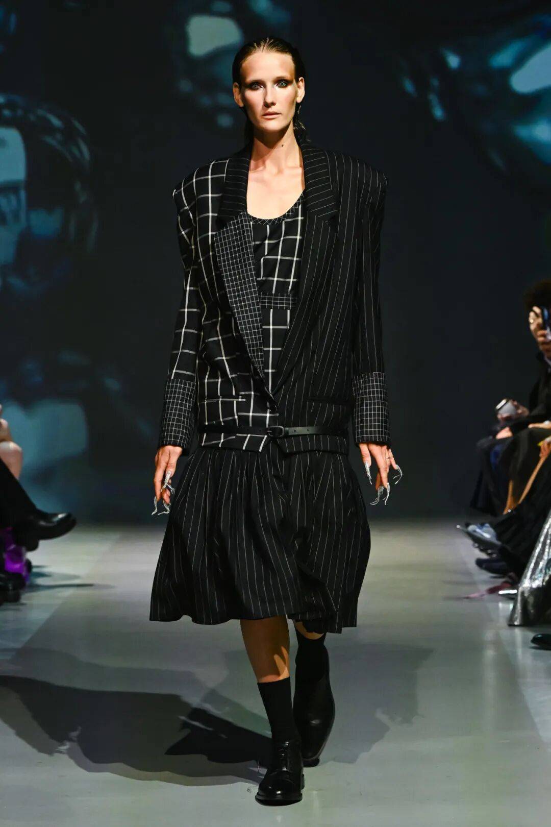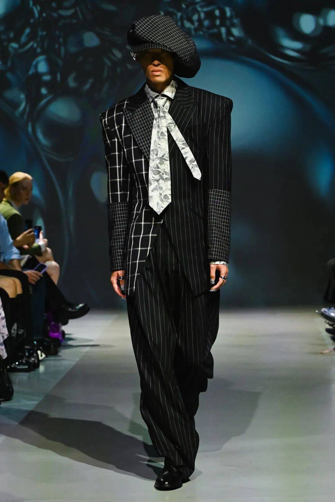 服装本身以笃定之姿承载这种二元性:羊毛西装料、细条纹与正装配饰以传统剪裁语言锚定根基,又解构为梯形几何量感跃入异次元。
