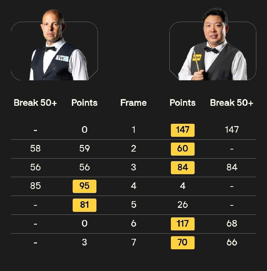 全场比赛,张安达打出一杆单杆147满分杆和3杆单杆50 ,巴里-霍金斯打出三杆单杆50 。
