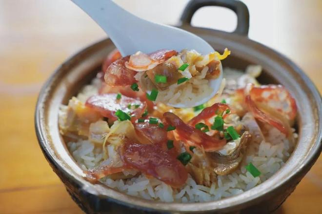 如果说肉质醇厚、紧实的红鱼干,是这份煲仔饭的灵魂,那腊肠、鸭蛋等配料,也是不可或缺的配角,各种食材的搭配相得益彰,为味蕾带来了丰富的味觉享受。