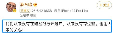 硅谷银行破产后,潘石屹公开“辟谣”,“我们从来没有在硅谷银行开过户,从来没有存过款”,这种“此地无银三百两”式的“辟谣”的可信度有多高就不说了,就算潘总没在硅谷银行存过款,但总要存款的吧,不在这家银行存,就要在那家银行存,总不可能把巨额财产都放家里吧,那问题来了,躲得过初一,能躲得过十五吗?说难听点,美国早就在算计怎么没收中国人在海外的资产了,这一刀只怕潘总早晚要挨吧。