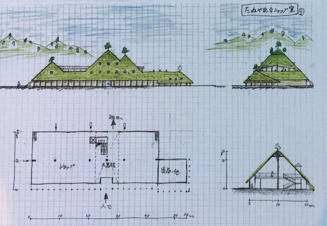 La Collina的建筑群中最早落成的是主店面「草屋根」。在日本与法国,都有许多在屋顶种草的古民家案例,藤森先生认为这是植物与建筑结合的最佳方案,再加上背后的八幡山是属于附近日牟礼八幡宫的神宿之山,让这座建筑谦逊迎合周遭的环境才是正确的做法。